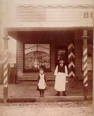 The family arrived on the 15th May 1887 ix and first settled in Pickup Street, Alexandria, a Sydney suburb, amongst the German community and then a year later moved to the far out suburb of Rockdale. The first appearance of F.W. Laue in the Sands Directories was in 1890 where he had listed his business as a tobacconist at Rocky Point Road, Rockdale. x He also operated a hairdressers in Rocky Point Road, Rockdale (now called Princes Highway) but later bought a double fronted shop which was also on Rocky Point Road. The family lived above the shop for 24 years.Four more children were born at Rockdale, Edward, Marie, Charlotte and Victoria. Marie died as a baby, and there was an 18-year gap between the twins and Victoria. Interestingly, Victoria's birth certificate was falsified to cover up the family ' problem'. Her parents are listed as having been married on 19th March 1881 in Wismar, Germany and the twins listed as having been born in 1882. iii He also purchased a tobacconist shop in the Tramway Arcade (near where the buses terminate today). The children were all expected to help in both shops. The photo on the right shows Victoria with her father outside the shop. Frederick was a member of the St George Bowling Club, which used to be alongside the railway station at Rockdale before it moved to Harrow Road, Bexley. In 1901 he won the beginner's handicap and was presented with a set of wooden bowls. This set was taken to the U.S.A. by his son Edward but was later returned to Australia and presented to the club by his daughter, Victoria, as part of the club's 75th anniversary celebrations. xi The family attended the Methodist Church in Bay Street, Rockdale. |