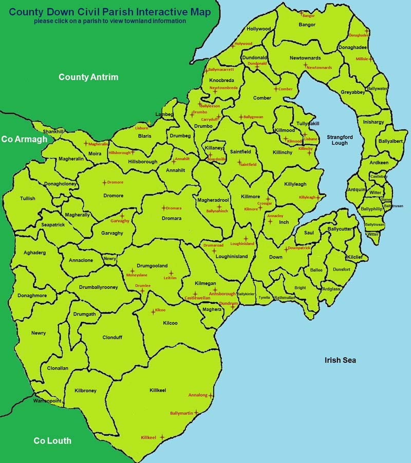 This is a map of the Catholic parishes of Co. Down; see below for key
