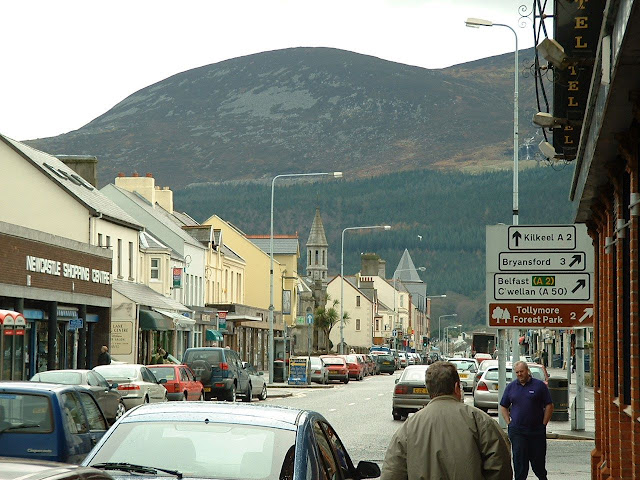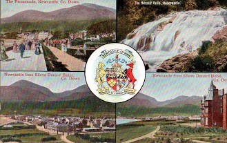 Lord Annesley built a pier in late 1820s but it was never a favourite port for larger vessels. It was mainly a base for fishermen and the coastguard. I n 1836 there was a Church of Ireland & a Catholic chapel, and a school in town .The Catholic Parochial House is here. The fishing disaster of 1843 when 46 men from Newcastle & 27 from Annalong perished in a hurricane. Widow's Row, near the habour,was built to accommodate the grieving families. 1830 really marks the start of Newcastle's development in the 19th century for in that year the 3rd Earl decided to build a' marine residence' for himself and growing family at Newcastle. This was a large two-storey house built of granite on the slopes of Slieve Donard, great views of Dundrum Bay and called Donard Lodge. Lord Annesley also considered how Newcastle could be developed as a resort. At this time there were only 160 houses in the village which were simply thatched and whitewashed cottages. There was a Methodist meeting-house, a police barracks, a Post Office kept by James Hyland , several shops and public houses (like George Mulligan's) ,a Hibernian Society School run by Miss Martha McKegney and a cluster of fishermen's huts in King Street. The population in 1831 was 987 people. The first improvement was the erection of the Annesley Arms Hotel on the site of the old Magennis castle. Nearby a bath-house and a pavilion were built, then an Anglican church and a stone pier. Cottiers and fishermen were discouraged from living there. By 1850 Newcastle was recognised as one of the best resorts for the gentry. The railway from Belfast opened on 26th March 1869 and this brought new prosperity to Newcastle. ( Email me for a photo of the railway station c. 1900 ( 27 Mar 1967R,DR*). More hotels were built, with the magnificent Slieve Donard Hotel opening on the 21st June 1898. It continued to be a major resort town and still is today. Cultural Feis organised here Jul 1904 (LR 2005 p49-54). The population in 1910 was 1553 people. (POD) Newcastle during Second World War (LR 2013 p9-12) There is an article in Lecale Miscellany 2002 about the lifeboat crews of Newcastle & Dundrum Bay. articles from Down Recorder newspaper; article from Mourne Observer newspaper; Newspaper article from Newtownards