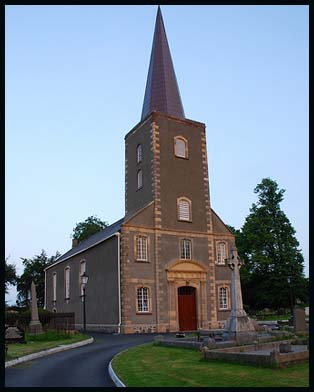 It has a tower with a low, shingled spire and held 400 people