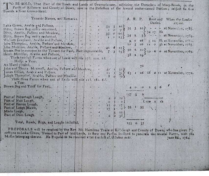 15 Jun 1764, page 3; sale of part of Drumnaconnor townland in Kilmore parish by Rev. Hamilton Trail |